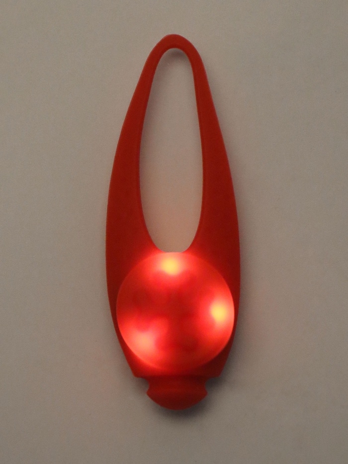 Маячок крепится на ошейник или поводок и оснащен тремя режимами свечения: постоянным, медленным и быстрым миганием.