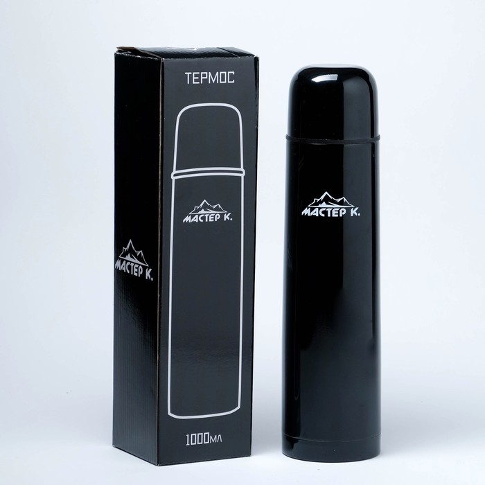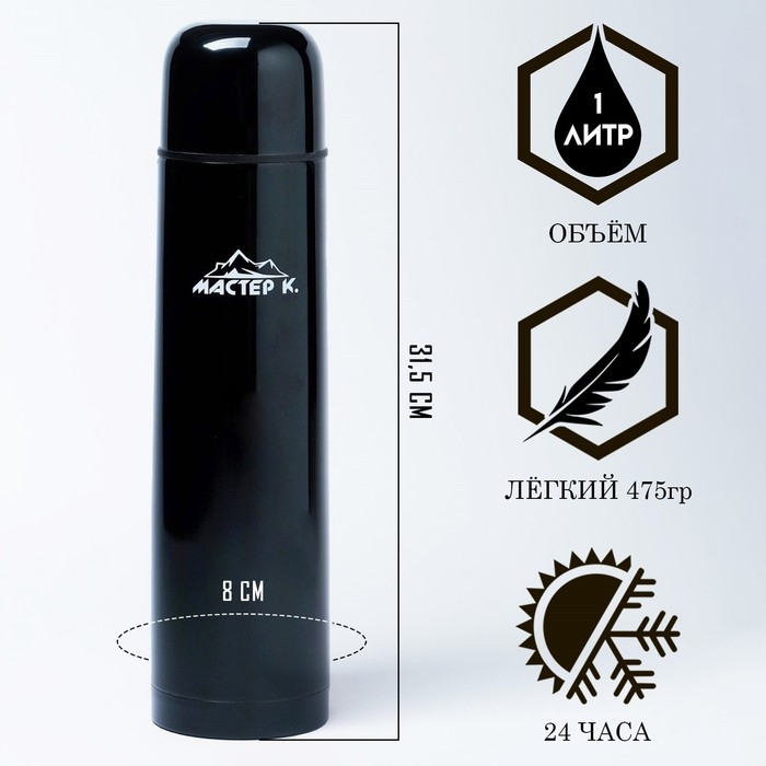 Термос, 1 л, Гильза "Мастер К", с кружкой, сохраняет тепло 24 ч, гарантия 5 лет, чёрный