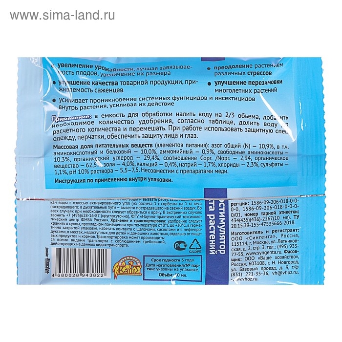 Массовая доля питательных веществ (элементов питания): азот общий (N) — 10,9%, в т.ч. аминокислотный и белковый — 10,0%, аммонийный — 0,9%, свободные аминокислоты — 10,3%, органический углерод — 29,4%, соотношение Сорг. /Nорг. — 2,94, органическое вещество — 62,5%, зола — 4,0%, кальций — 0,4%, натрий — 1,7%, хлориды — 2,3%, сульфаты — 1,1%, рН 10% раствора — 5,5–7,5.