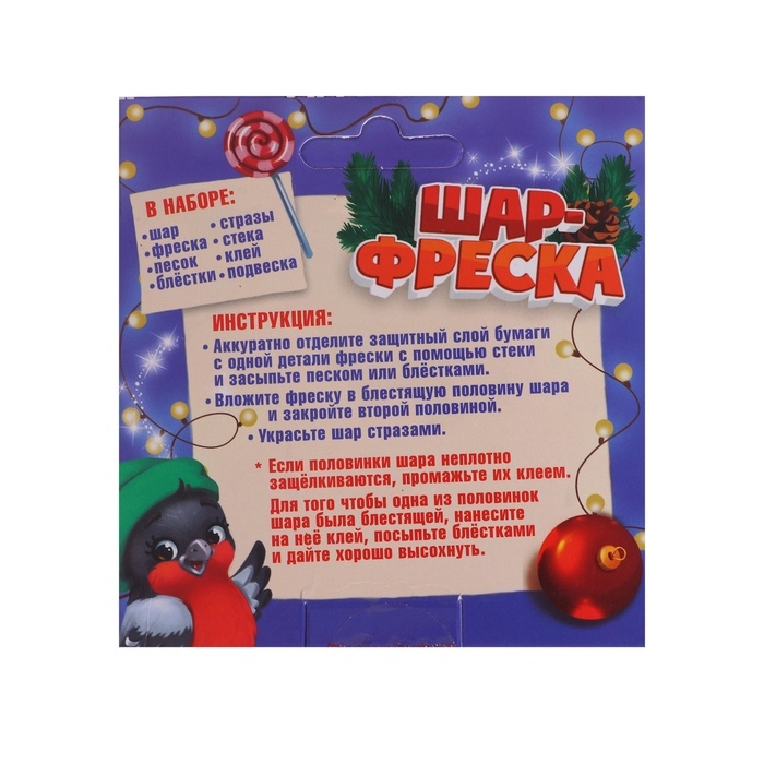 Шар фреска - это не только необычное праздничное украшение на елку, но и отличный повод заняться творчеством вместе с ребенком. Внутри набора есть все необходимое, а на обороте упаковки инструкция, которая поможет вам создать красивый новогодний сувенир.