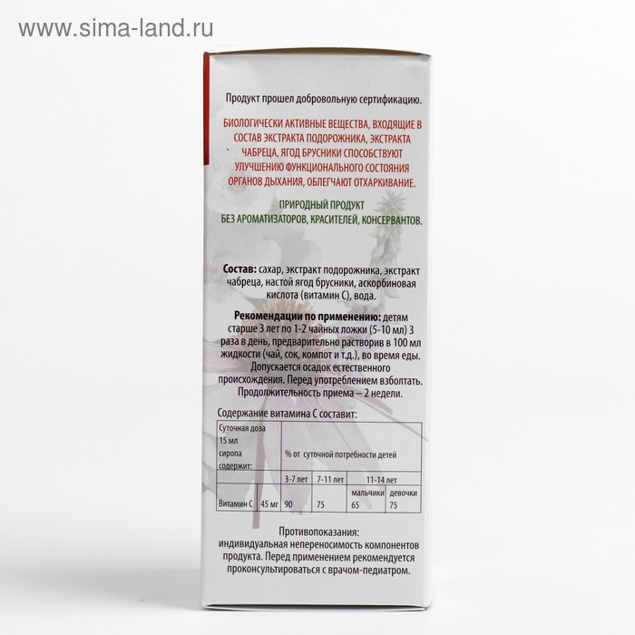 Состав: сахар, экстракт подорожника, экстракт чабреца, настой ягод брусники, аскорбиновая кислота (витамин С), вода.