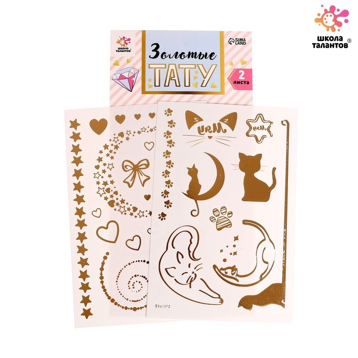 Детские татуировки-переводки, 10×15 см, набор 2 листа, золото, «Котики, сердца и звёзды»