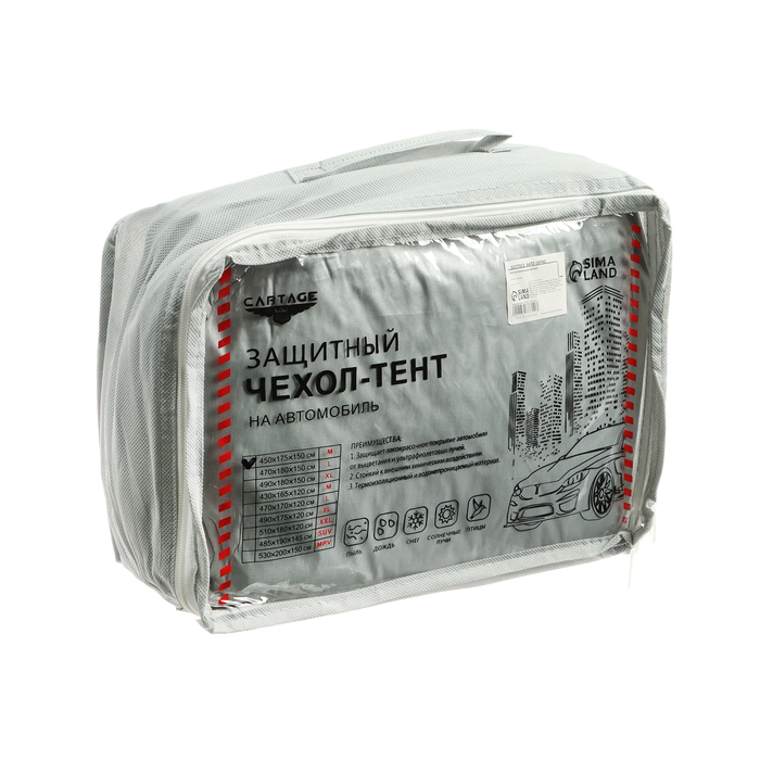 Тент автомобильный CARTAGE изготовлен из полиэстера, среди преимуществ которого высокие показатели прочности и влагонепроницаемости. Чехол стоек к внешним химическим воздействиям и обладает хорошей термоизоляцией.