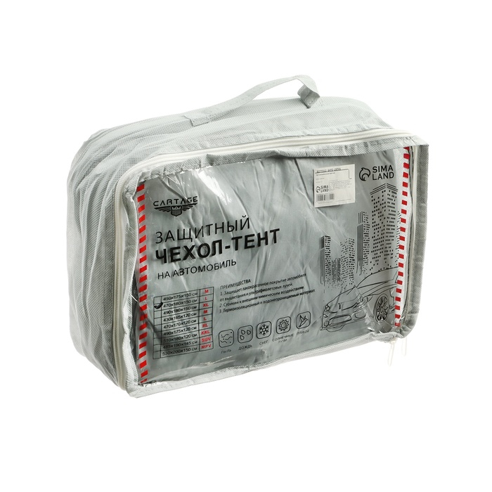 Тент автомобильный CARTAGE изготовлен из полиэстера, среди преимуществ которого высокие показатели прочности и влагонепроницаемости. Чехол стоек к внешним химическим воздействиям и обладает хорошей термоизоляцией.