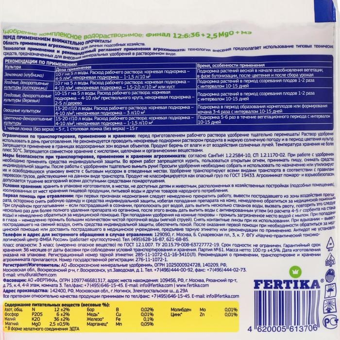 Удобрение минеральное Фертика Финал NPK 12:6:36 + МИКРО, 100 г