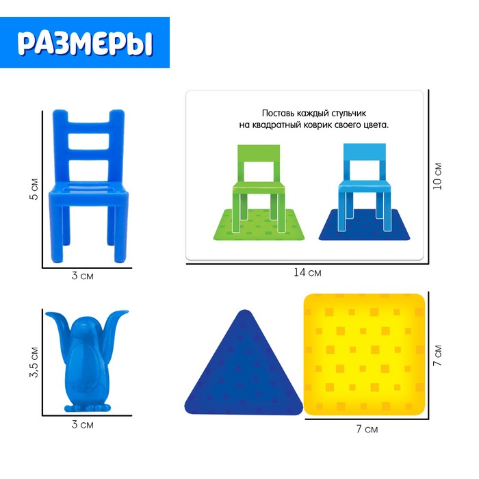 С настольной игрой «Пингвины и стульчики» малыш получит много новых и полезных знаний! Малыша ждут птички с яркими ковриками разных форм и весёлые задания на карточках.