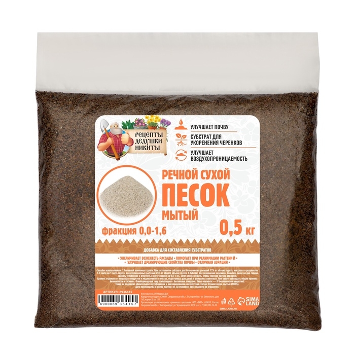 Речной песок "Рецепты дедушки Никиты", сухой, фр 0,0-1,6, 0,5 кг