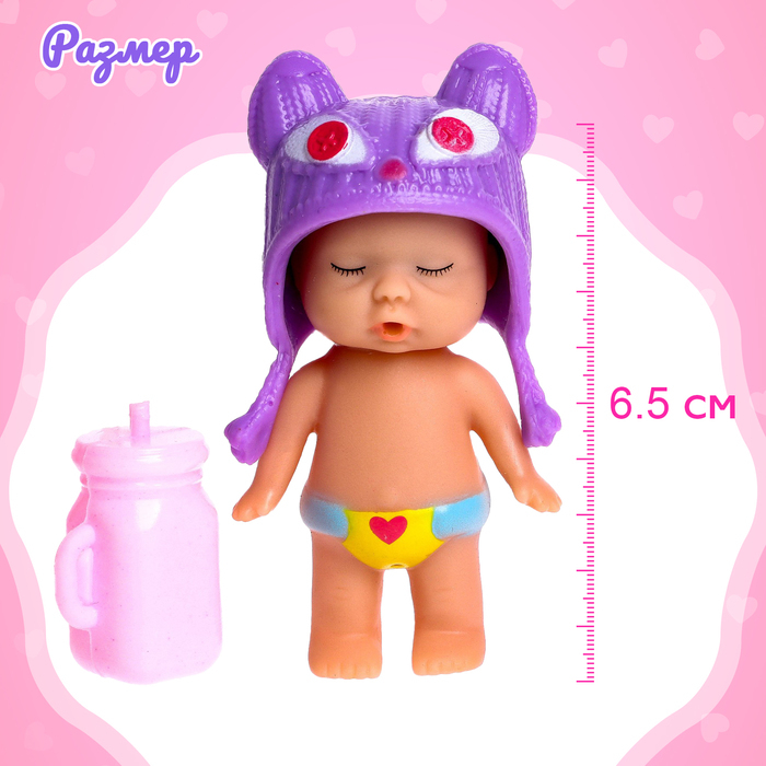 - Высота пупсов — 6,5 см. Игрушки очень компактные, поэтому их удобно захватить с собой на прогулку, в гости и даже в путешествие!