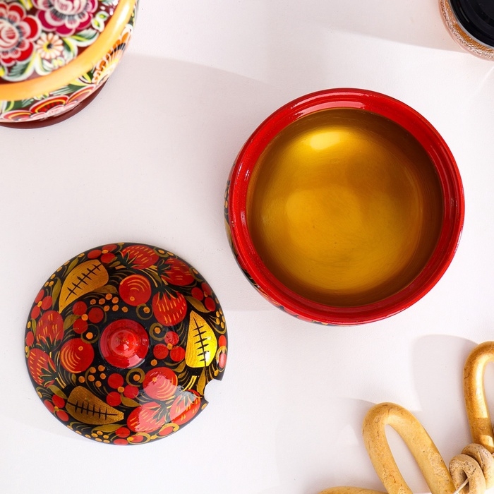 Традиционные элементы Хохломы — ягоды рябины и земляники, цветы и листья, птицы, рыбы и звери.