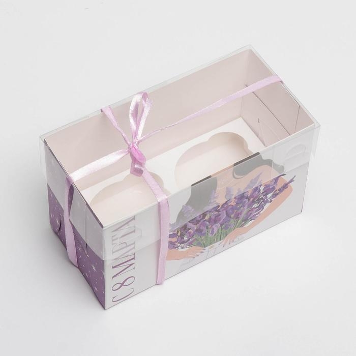 Коробка для капкейков, кондитерская упаковка с PVC крышкой, 2 ячейки, «8 марта», 16 х 8 х 10 см