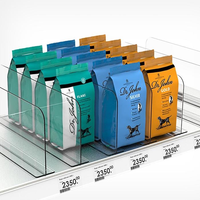 Универсальный разделитель высотой 150 мм с нижним Т-профилем. Конструкция обеспечивает простоту применения - разделитель прижимается к полке товаром.
