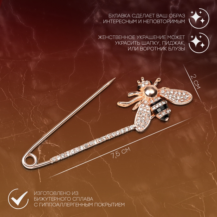 Данная булавка – настоящая находка для модниц, предпочитающих нетривиальные аксессуары. Брошь-булавка станет не только оригинальным дополнением вашего наряда, но и позволит без труда приколоть при необходимости палантин или шейный платок. Используйте её в качестве украшения шляпки, рубашки или галстука. Булавка «Пчела» со стразами, 7,5 см, цвет чёрно-белый в розовом золоте внесёт особую нотку изящности в ваш образ.