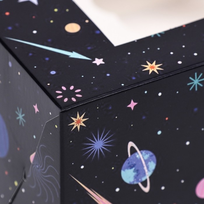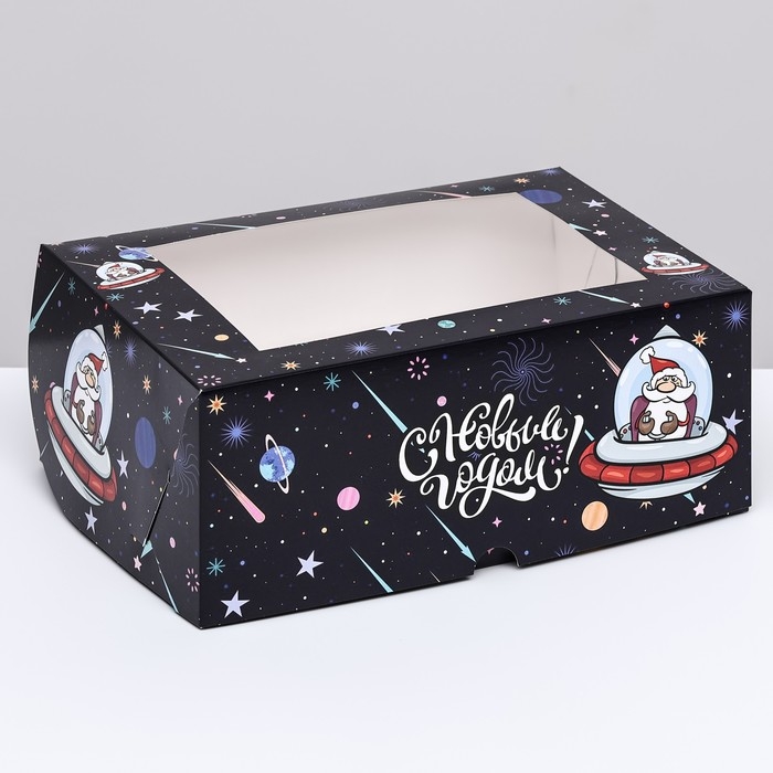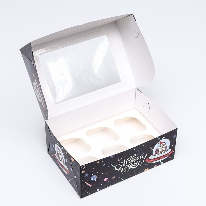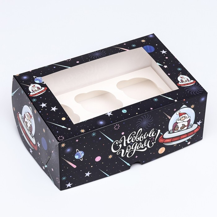 Коробка для 6 капкейков с окном подарочная новогодняя упаковка, "Космический Дед Мороз», 25 х 17 х 10 см.