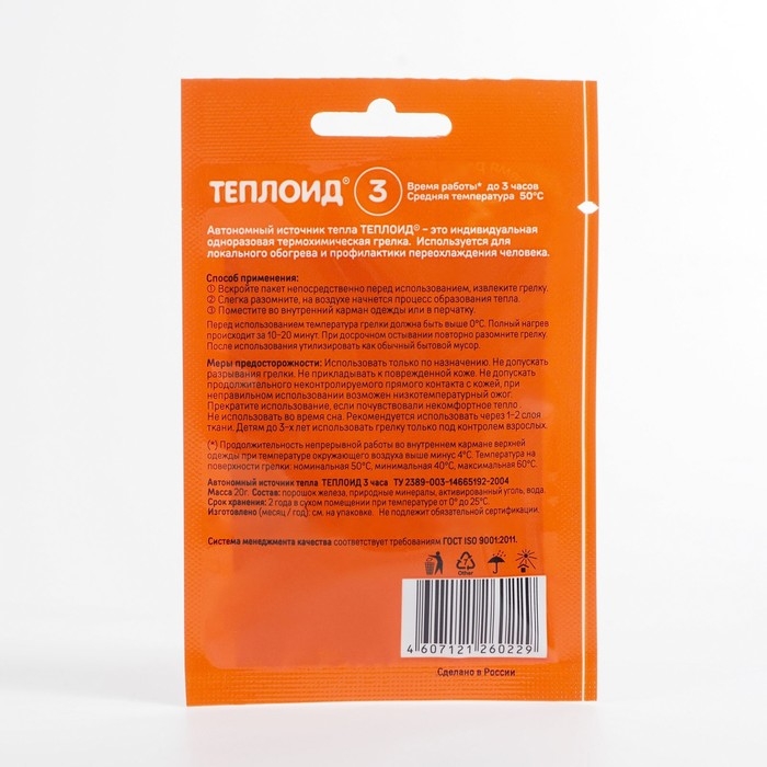 Автономный источник тепла "Теплоид" - это одноразовая грелка, которая не нуждается в электричестве или топливе, генерируя тепло автономно. Обычно его размещают во внутренних карманах одежды, в рукавицах, обуви.