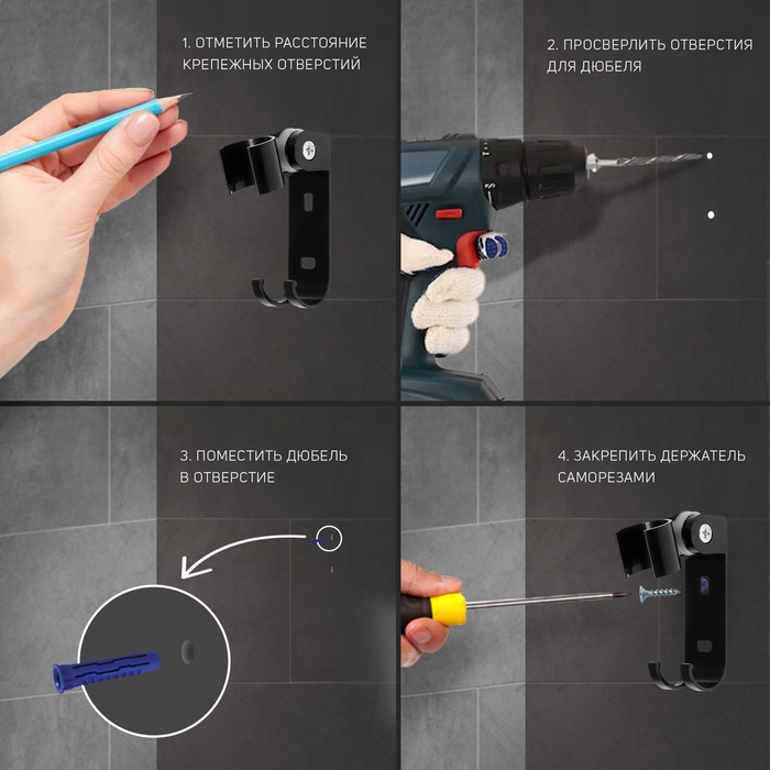 Держатель для душевой лейки ZEIN Z107, нерегулируемый, самоклеющийся, черный