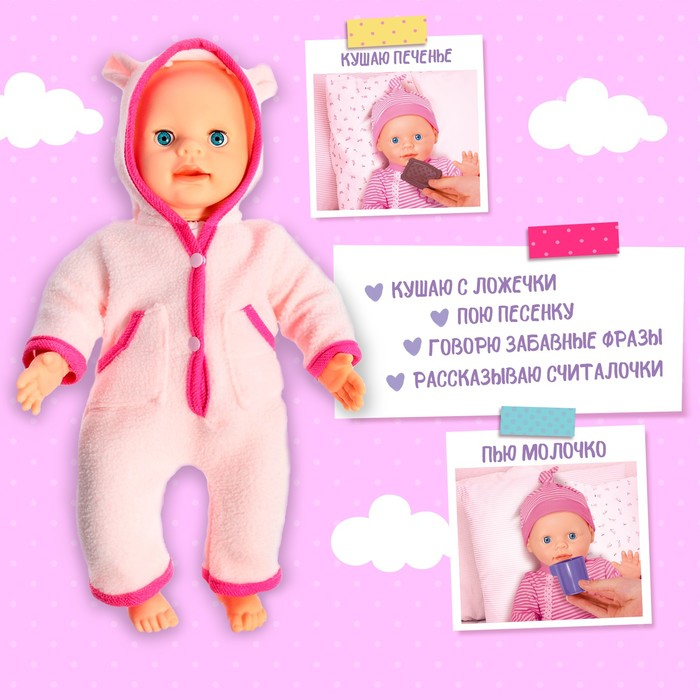 - Пупс ест с ложечки (причмокивает), пьёт (имитация, реагирует на кружечку), ест печенье (звук откусывания, если поднести печенье).