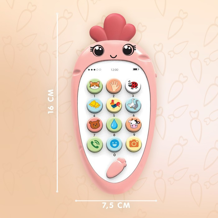 Малыш обязательно подружится с музыкальным телефончиком в виде забавной морковки. Крошка-моркошка издаёт смешные звуки, говорит забавные фразы и знает 9 весёлых песенок.