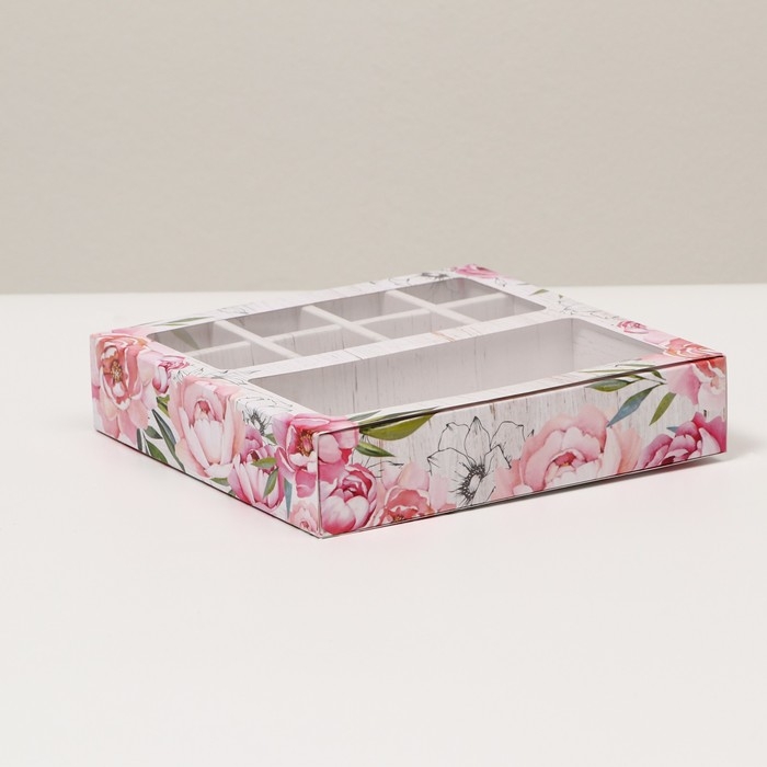 Коробка под 8 конфет + шоколад, с окном , пионы, 17,7 х 17,85 х 3,85 см