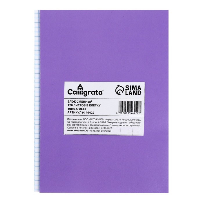 Сменный блок для тетрадей на кольцах А5, 120 листов, в клетку, Calligrata, блок офсет № 160 гр/м2, белизна 100%,