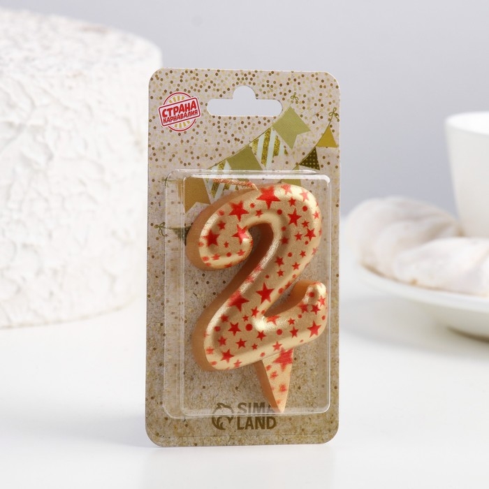 Свеча в торт "Саната", цифра "2", золотая с красными звездами, 5,5 см