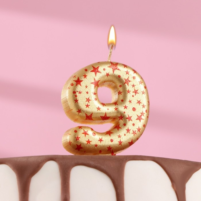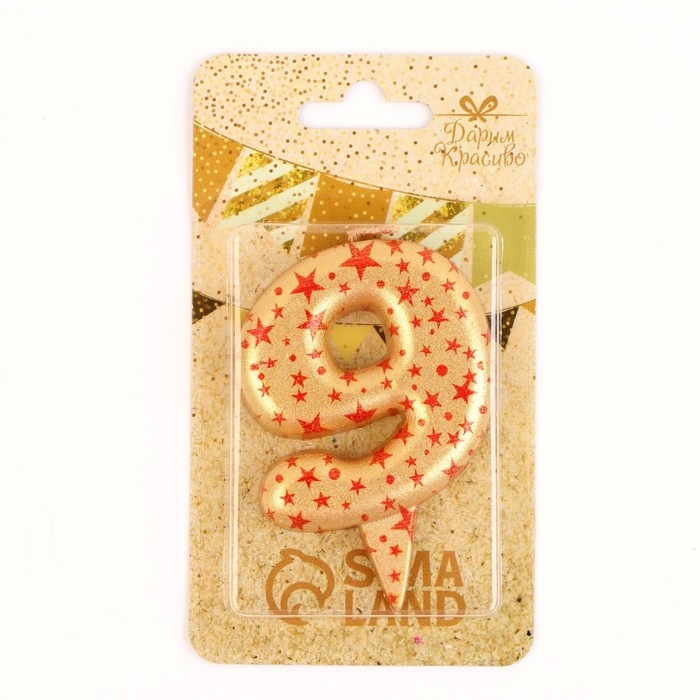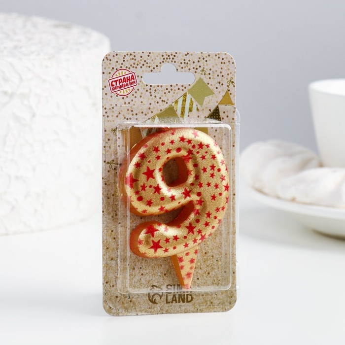 Свеча в торт "Саната", цифра "9", золотая с красными звездами, 5,5 см