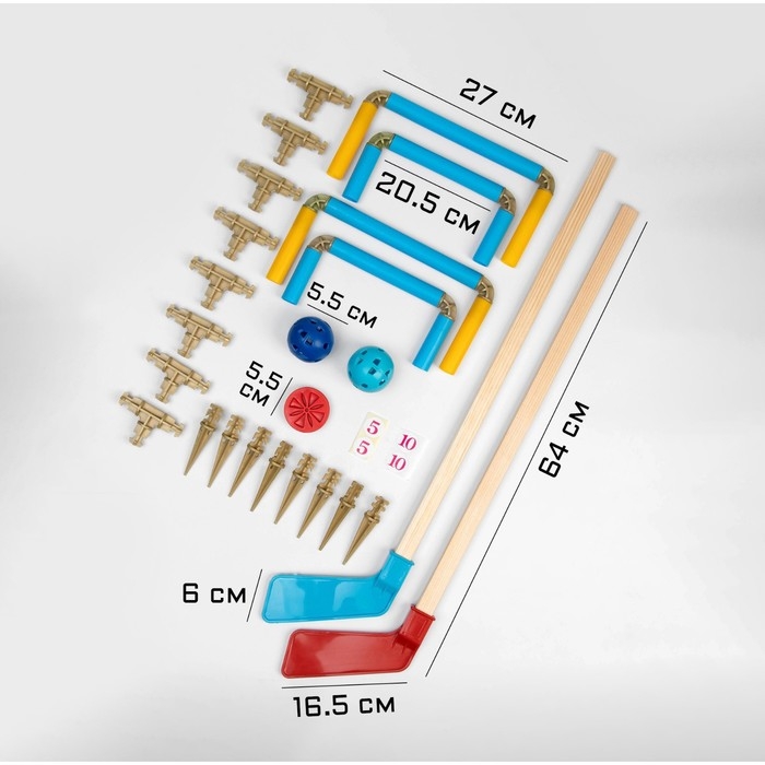 Хоккейный набор 3 в 1, 2 клюшки 73 см, ворота 4 штуки, 2 мяча d-5.5 см, клин 8 штук