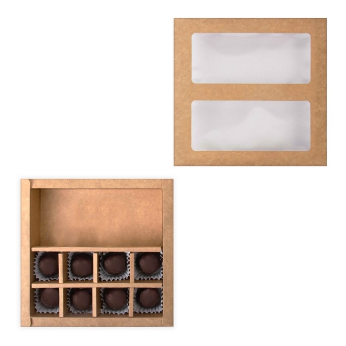 Коробка для 8 конфет + шоколад, с окном, крафт, 17,7 х 17,85 х 3,85 см. Кондитерская упаковка