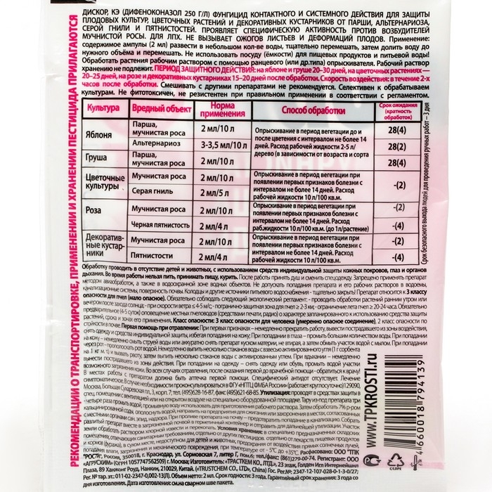 Средство от болезней растений представляет собой системный фунгицид для защиты плодовых культур от хозяйственно значимых заболеваний, а также картофеля от альтернариоза.