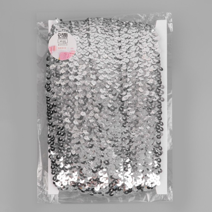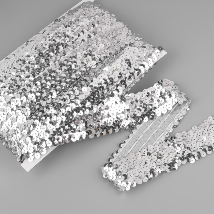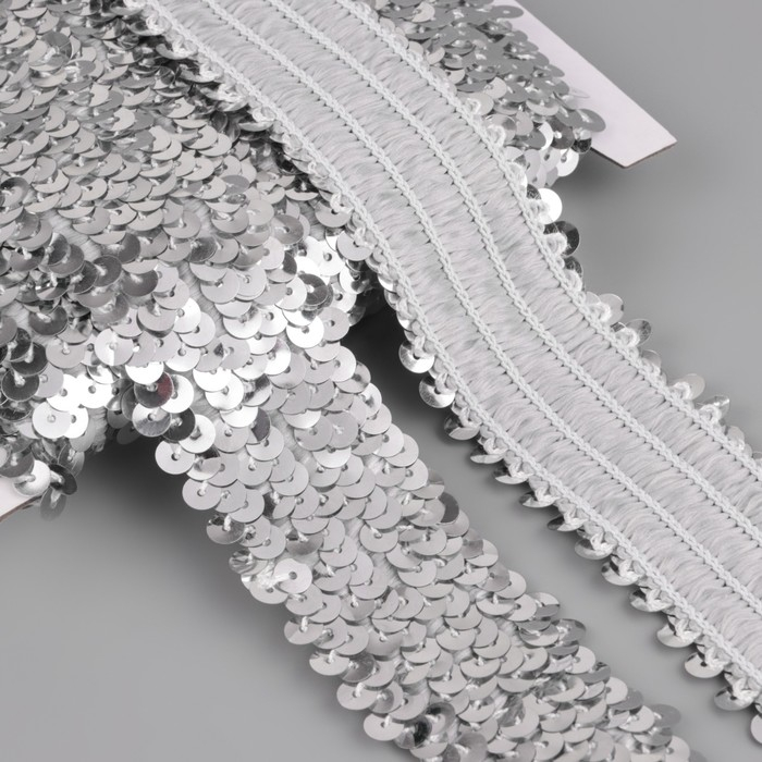 Тесьма декоративная с пайетками, на резинке, 3,5 см, 9 ± 0,5 м, цвет серебряный