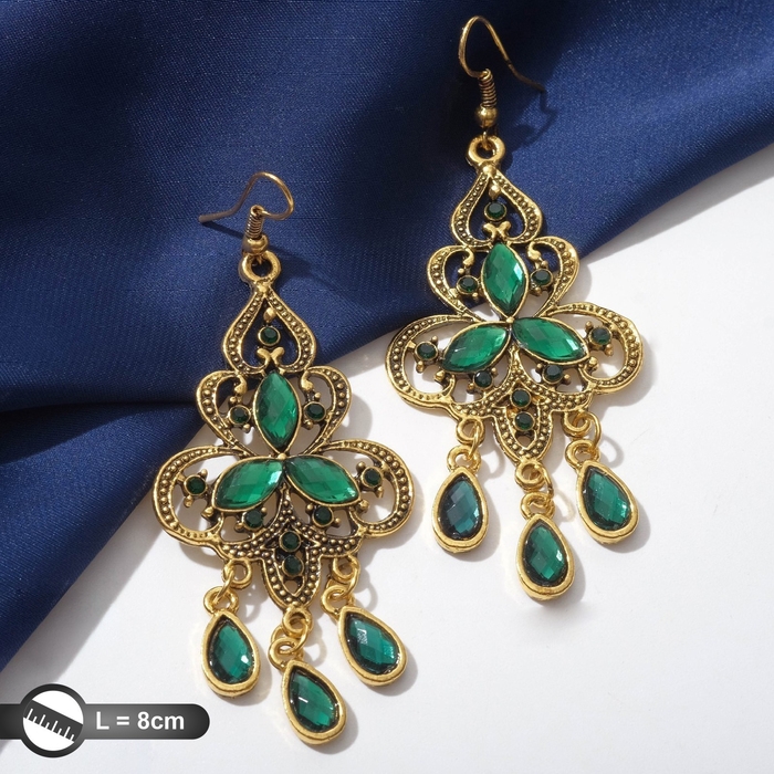 Серьги висячие со стразами «Восток» трилистник, цвет зелёный в чернёном золоте, 8 см
