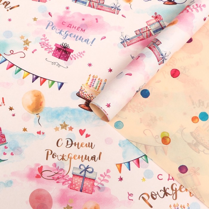 Бумага упаковочная, глянцевая двусторонняя "С Днем Рождения!", 70 х 100 см