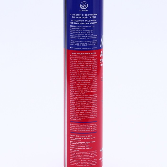 ОписаниеАэрозоль универсальный от ползающих и летающих насекомых представляет собой водную эмульсию действующих веществ, синергиста и других технологических компонентов. Не содержит хладонов и озоноразрушающих веществ. Средство обладает высоким инсектицидным действием (остаточное действие до 28 суток).Средство предназначен для уничтожения летающих (мухи, комары, москиты, бабочки моли) и нелетающих (тараканы, муравьи, клопы, блохи) и обработки мест посадки мух в помещениях разных типов, специалистами организаций, имеющих право заниматься дезинфекционной деятельностью, и населением в быту.**СОСТАВ**Циперметрин 0,2%, тетраметрин 0,16%, перметрин 0,16%, синергист-пиперонилбутоксид 0,5%.СоставЦиперметрин 0,2%, тетраметрин 0,16%, перметрин 0,16%, синергист-пиперонилбутоксид 0,5%.