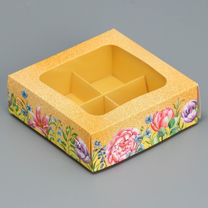 Коробка для конфет, кондитерская упаковка, 4 ячейки, «Цветы», 10.5 х 10.5 х 3.5 см