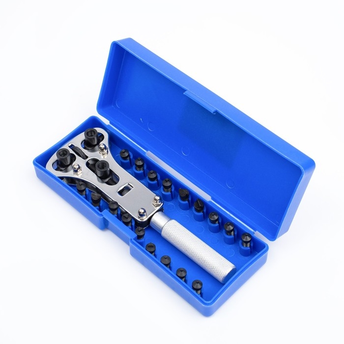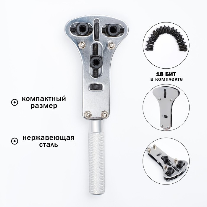 Разводной ключ для открытия винтовых крышек часов, 18 насадок