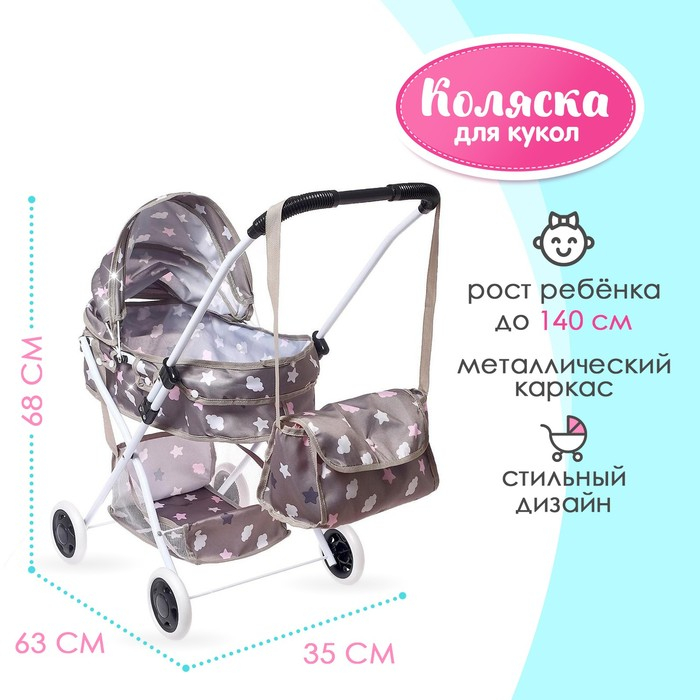 Каркас коляски выполнен из металла, колёса — из пластика. Размер в собранном виде: 63 × 35 × 68 см. Люлька съёмная, дно выполнено из картона. Размер переноски: 46 × 24 × 13 см. Высота от пола до люльки — 40 см, от пола до ручки коляски — 68 см. Под рукой малышки будет всё необходимое. В удобную вместительную сумку девочка уберёт нужные вещи и предметы для куклы. Размер: 24 × 14 × 14 см.