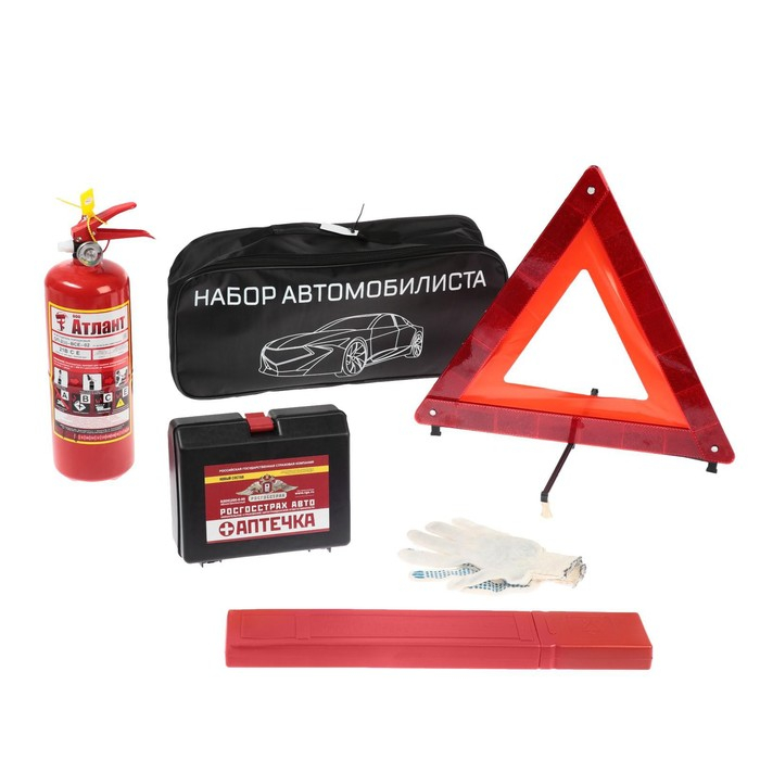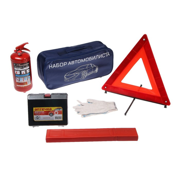 Набор автомобилиста "Стандарт" Престиж №3, на 5 предметов незаменимый аксессуар в вашем автомобиле, в комплект входят знак аварийной остановки, аптечка, порошковый огнетушитель и перчатки. Все упаковано в компактную и надежную сумку которая не займет много места в багажнике.