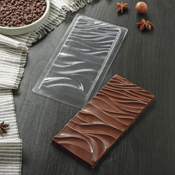 Форма “Волны” имеет прямоугольную форму с волнообразным рельефом, который придаст вашим шоколадным плиткам необычный и стильный вид. С ее помощью вы можете легко и быстро сформировать шоколадную плитку с интересным рельефом, который порадует вас и ваших любимых.