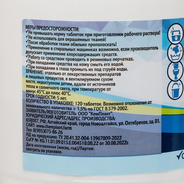 Не превышать норму таблеток при приготовлении рабочего раствора! Не использовать для окрашенных тканей!