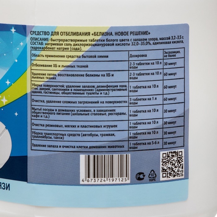 ОПИСАНИЕ: быстрорастворимые таблетки белого цвета с запахом хлора, массой 3,2-3,5 г.