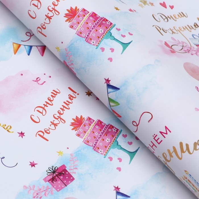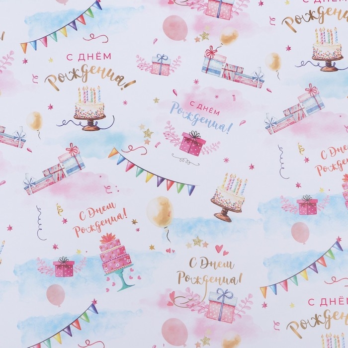 Бумага упаковочная,глянцевая "С Днем Рождения!", 70 х 100 см, 1 лист