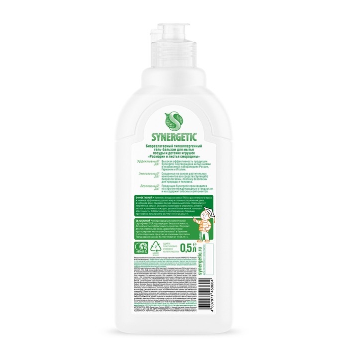 Биоразлагаемый гель-бальзам для мытья посуды и детских игрушек SYNERGETIC "Розмарин и листья смородины" - это экологичное, безопасное и эффективное средство для мытья всех видов посуды, в том числе детской, кухонного инвентаря и детских игрушек от любых видов загрязнений.