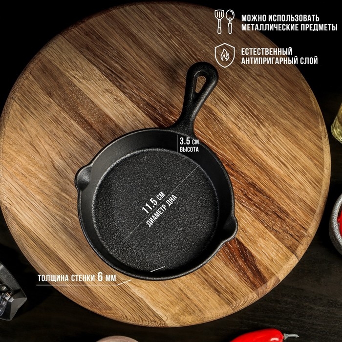 Сковорода чугунная Magma «Вилфред», 13,5×3,5 см, с 2 сливами и чугунной ручкой