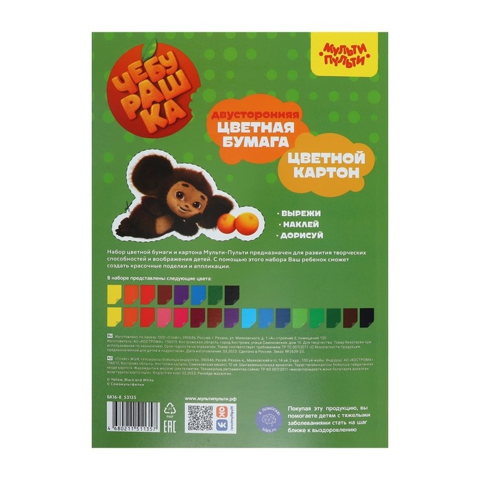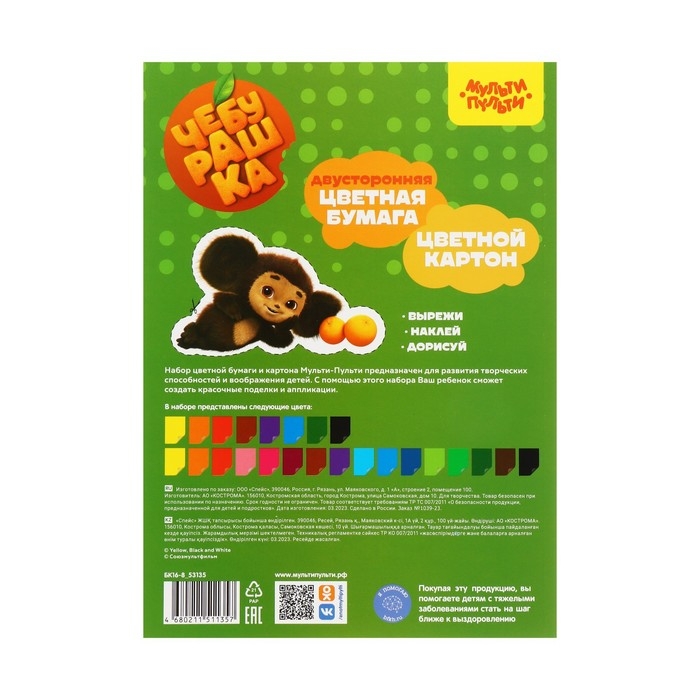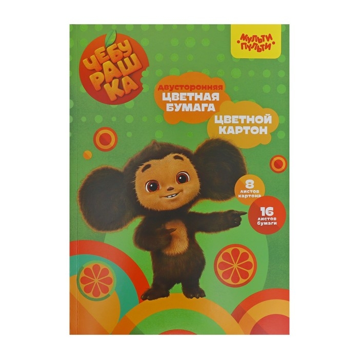 Набор цветного картона А4 8 листов (немелованный) и цветной бумаги 16 листов (газетная, двусторонняя) Мульти-Пульти "Чебурашка", на склейке