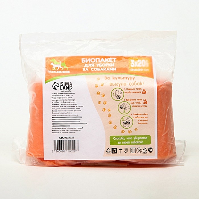 БИО Пакеты "Пижон" для уборки за собаками 20 х 30 см, 8 мкм, 3 х 20 шт, оранжевый