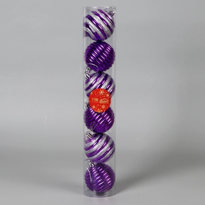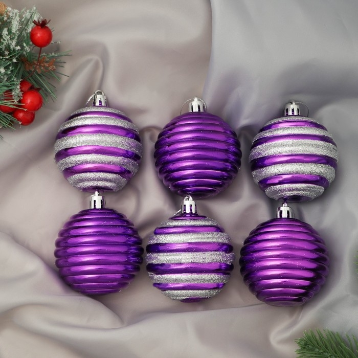 Набор шаров пластик d-6 см, 6 шт "Агнет" полосы, серебристо-фиолетовый