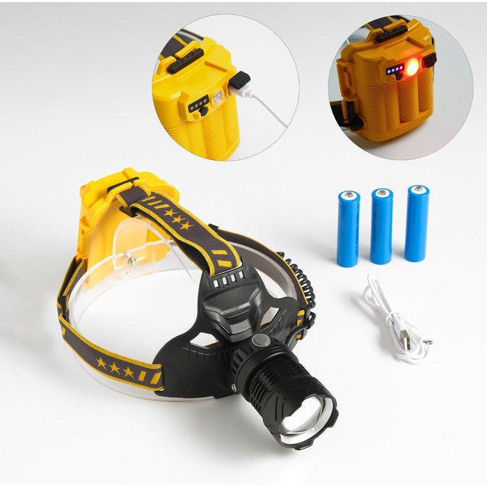 Фонарь налобный аккумуляторный, 10 Вт, 1000 мАч, 200 лм, LED, IPX3