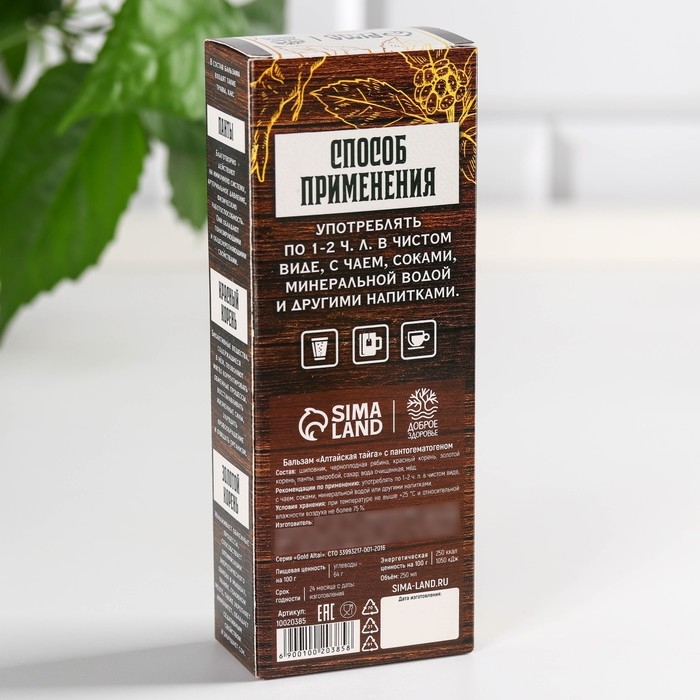 Состав: шиповник, черноплодная рябина, красный корень, золотой корень, панты, зверобой, сахар, вода очищенная, мёд.