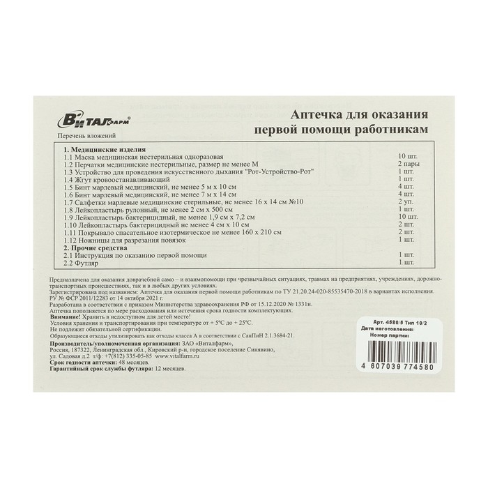Аптечка для оказания первой помощи работникам Виталфарм, по приказу № 1331н, пластик