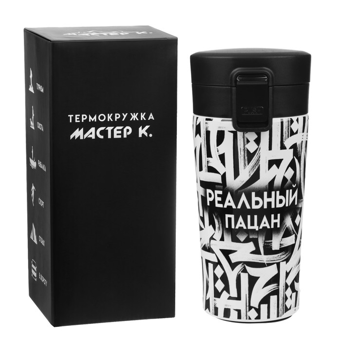 Термокружка для кофе и чая "Мастер К" идеальна для офиса, автомобиля, длительных прогулок и детям в школу. Благодаря специальному покрытию надежно лежит в руке.