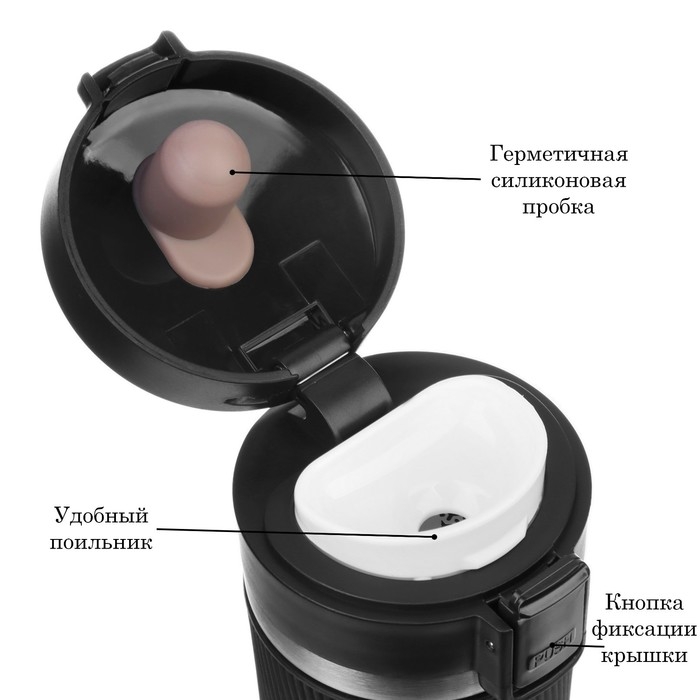 Термокружка сделана из нержавеющей стали марки 304, сконструирована по вакуумной технологии, с двойной стенкой, следовательно, долго держит тепло и не проливается. Снабжена откидывающейся крышкой, изготовленной из экологичного пищевого пластика, имеется кнопка с функцией блокировки, позволяющая с легкостью использовать термос одной рукой. На дне, термокружка имеет специальную прорезиненную основу, предотвращающую царапины на поверхностях.